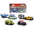 Metalowe zestawy pojazdów typu Explorer, dostępne marki: Polaris RZR Off Road Buggy, VW T6 Multivan z przyczepą i łódką, Ford F-150 Raptor Pick Up z przyczepą kampingową, Mercedes-Benz Zetros, bez napędu, ruchome elementy.