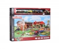Duża farma z warsztatem dla traktorów, sklepem ekologicznym, magazynem, silosem, wiatrakiem i wieloma akcesoriami, zestaw zawiera traktor z przyczepą i zwierzęta, może zostać połączony z innymi zestawami Majorette.